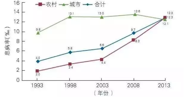 2017年6月,《中國心血管病報告2016》發(fā)布,報告概要刊登于中國循環(huán)雜志。國家衛生服務(wù)調查結果顯示,1993~2013年期間,我國腦血管病患病率整體呈上升趨勢,以前是城市高于農村,但目前已經(jīng)發(fā)生逆轉。2013年的第五次調查顯示,城市腦血管病患病率(12.1‰)有所下降,農村(12.3‰)仍呈明顯的上升。腦卒中現患人數約1300萬(wàn),腦卒中給中國造成的經(jīng)濟負擔每年高達400億元。