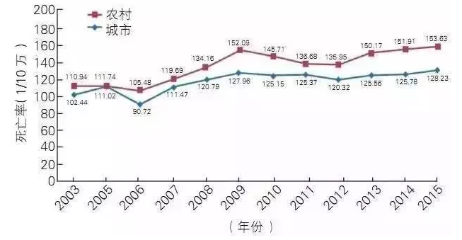 依據第六次人口普查數據,2015年死于腦血管病的城鎮居民為85.36萬(wàn)人,農村居民103.49萬(wàn)人?傮w上看農村地區腦血管病死亡率高于城市地區。進(jìn)一步分析表明,我國腦卒中死亡率下降的主要因素可能有以下幾種:1、中國整體醫療保障的改善;2、臨床診斷和救治技術(shù)的進(jìn)步;3、城市居民腦卒中發(fā)病率下降;4、卒中防治知識水平的普遍提高。經(jīng)濟狀況與健康知識會(huì )影響患病率與死亡率:卒中患病率和不同教育水平呈負相關(guān)關(guān)系,即小學(xué)和以下文化卒中患病率最高,大專(zhuān)及以上最低。